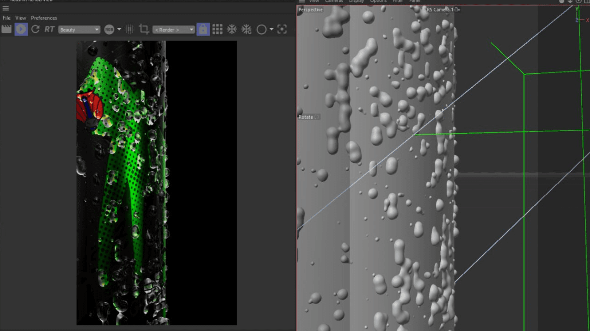 Cinema 4D & Volume Builder/Mesher: Создание уникальной системы симуляции капель. Благодаря этой связке удалось добиться физически корректного поведения жидкости: маленькие капли при движении по банке объединяются в крупные единые потоки.