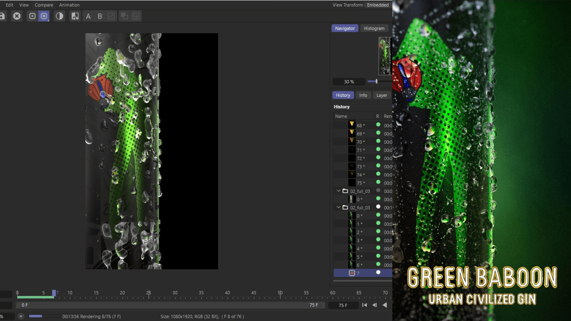 Green Baboon: Эстетика ледяного джина. Полноценный рекламный 3D-ролик, созданный для продвижения джин-тоника Green Baboon в социальных сетях. Проект сфокусирован на детальной визуализации продукта, где ключевым элементом выступает сложная симуляция конденсата и динамика капель на поверхности банки.