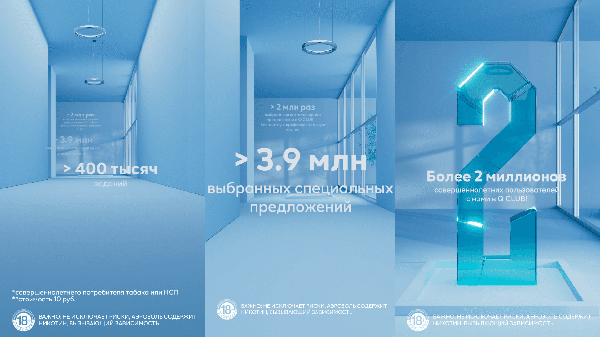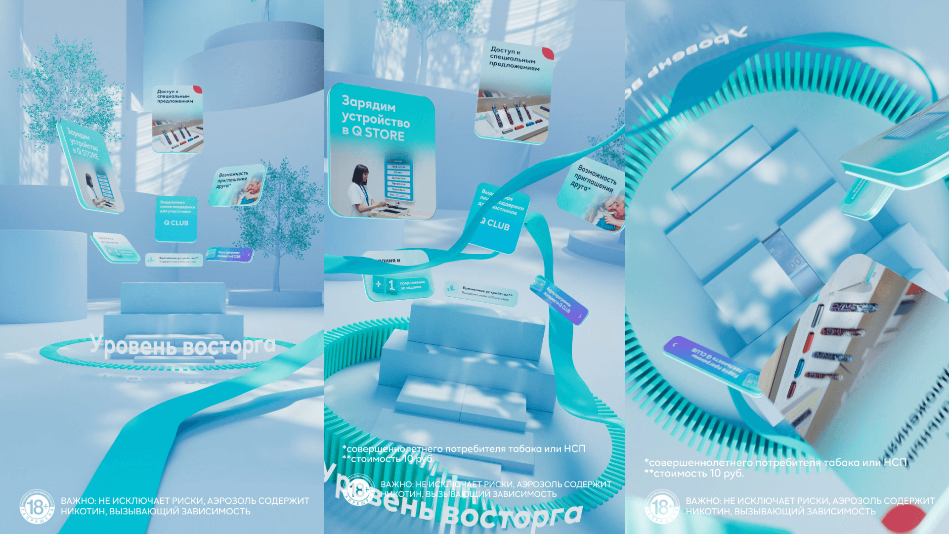 IQOS Q-CLUB: Эстетика лояльности в формате 3D. Зацикленный рекламный ролик, разработанный для трансляции в торговых центрах. Видео приглашает зрителя заглянуть «за закрытую дверь» бренда, где динамичная 3D-лента проводит его через ключевые привилегии клуба: от эксклюзивного сервиса до специальных предложений для участников.